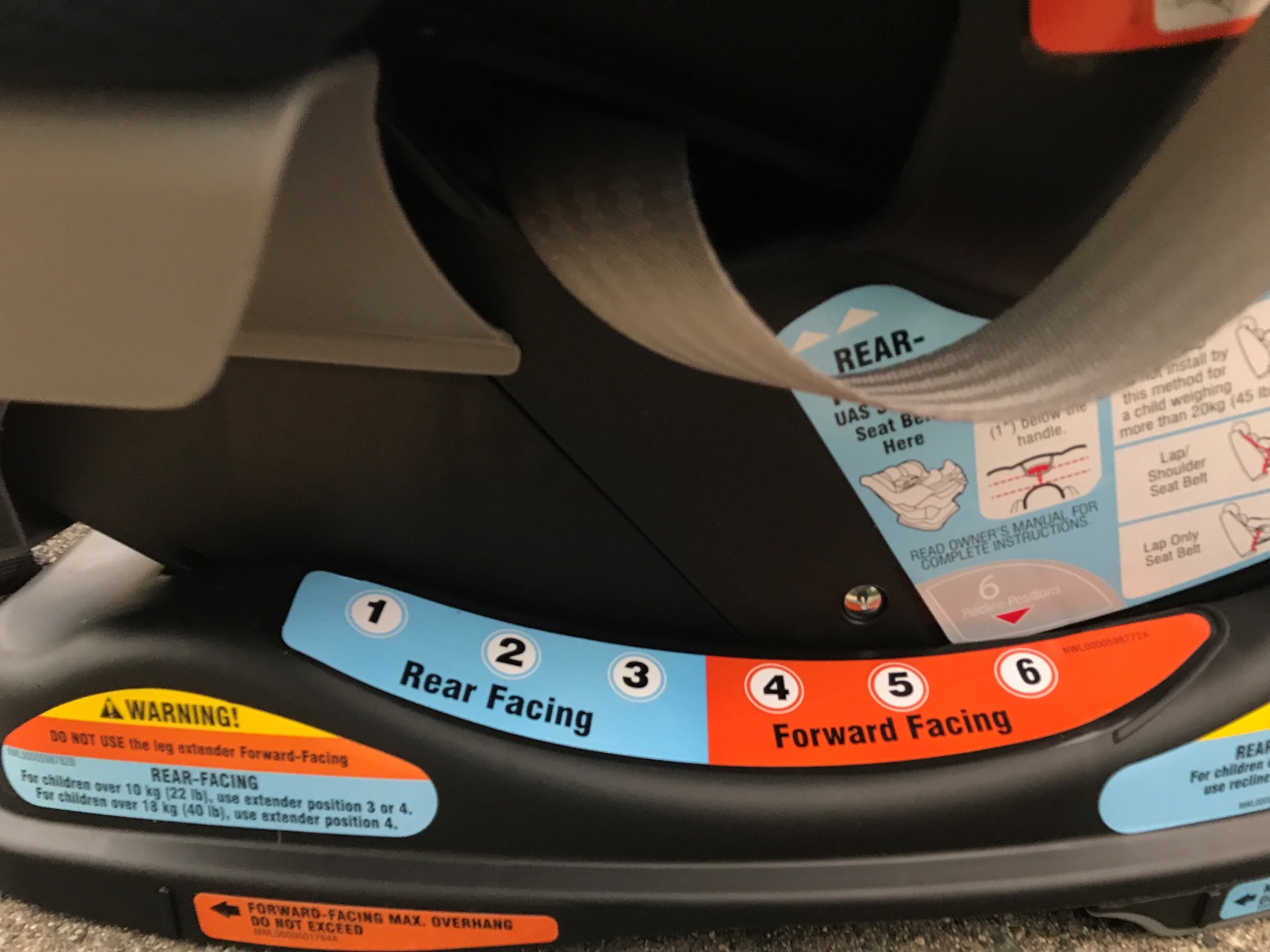 Transport Canada says that the minimum period of time in which you should rear face your child is 12 months before moving them over to front face. However, it’s recommended that you rear face your child for a minimum of 24 months if not longer. Parents often wonder whether a child’s legs pushing up to the ends of the seat are safe for them and tend to use this as the talking point to forward face a seat. The truth is, even for an 18 or 24 month old, rear facing still provides the safest injury prevention in accidents, as stated by pediatrician Ben Hoffman of the Doernbecher Children’s Hospital in Oregon.