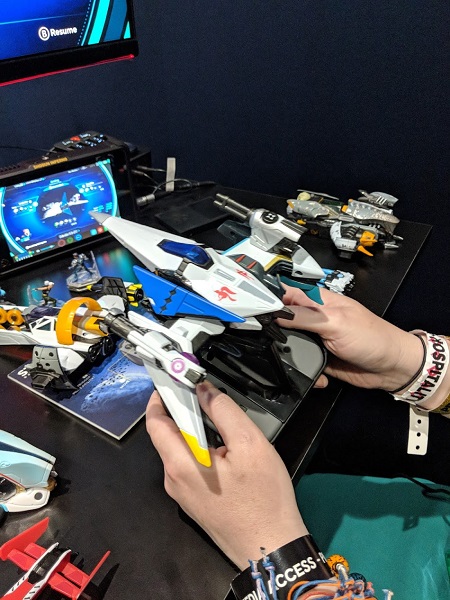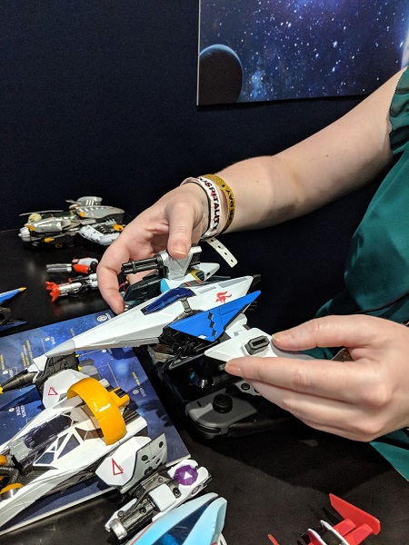 The action-adventure space shooter lets us build our own ship and play with it inside the game. Here’s how it works. First, you attach a base on the game controller. This will support the pilot, then the ship. What’s cool is seeing all the manipulations into the game in real time.